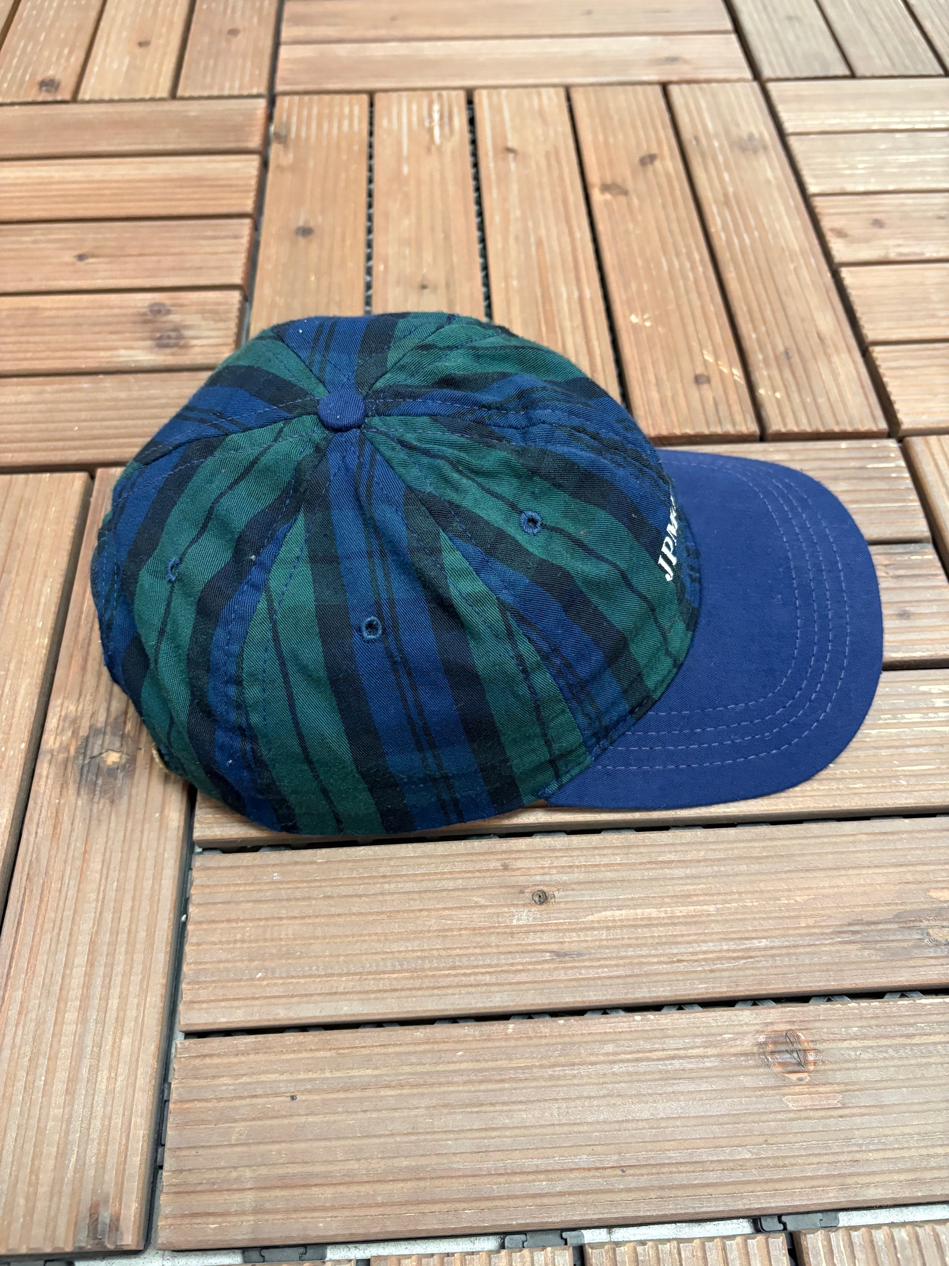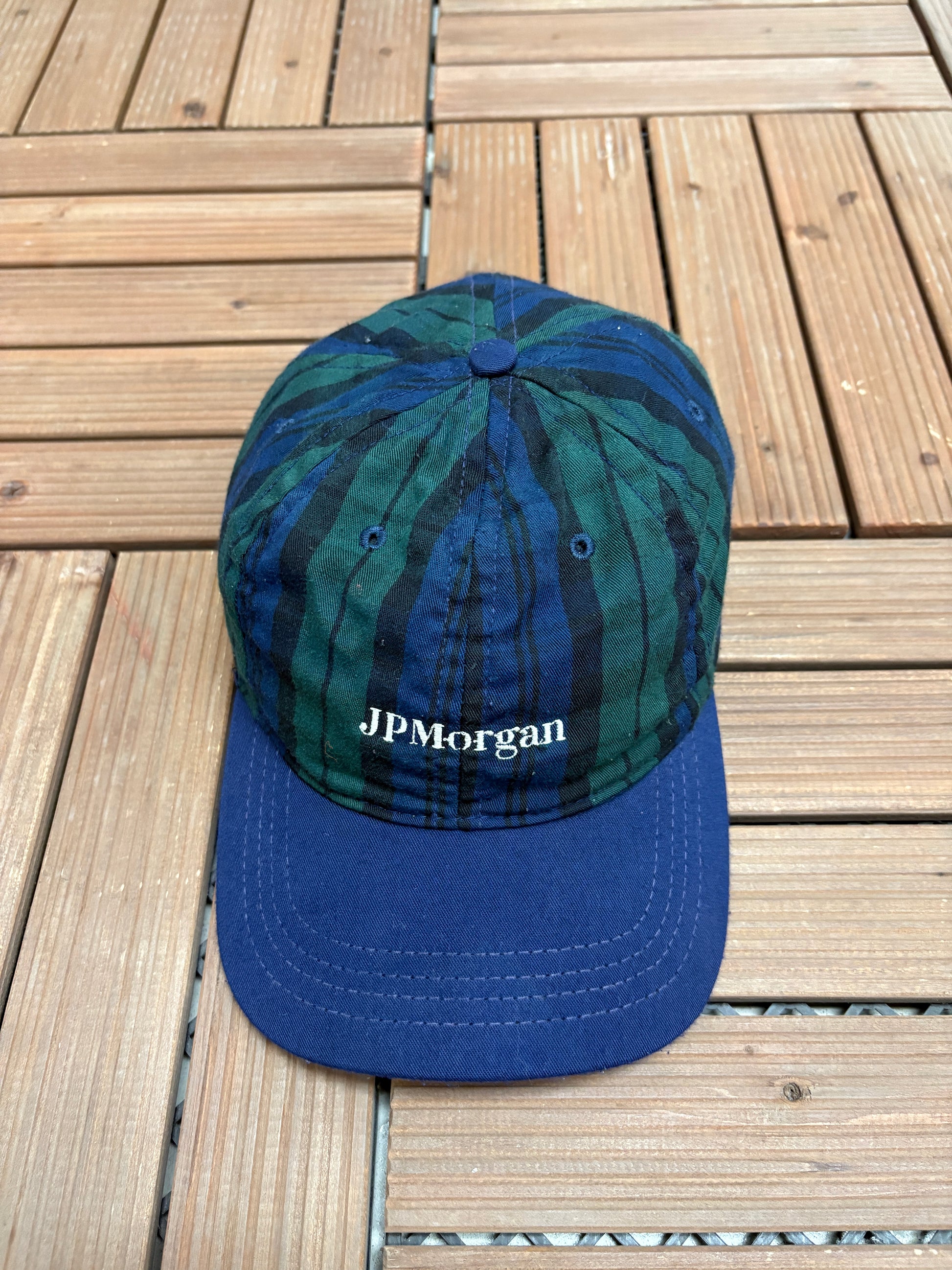 JPMorgan Embroidered Graphic Hat | Metal Clasp | Vintage 1990s Promotional Plaid Cap |