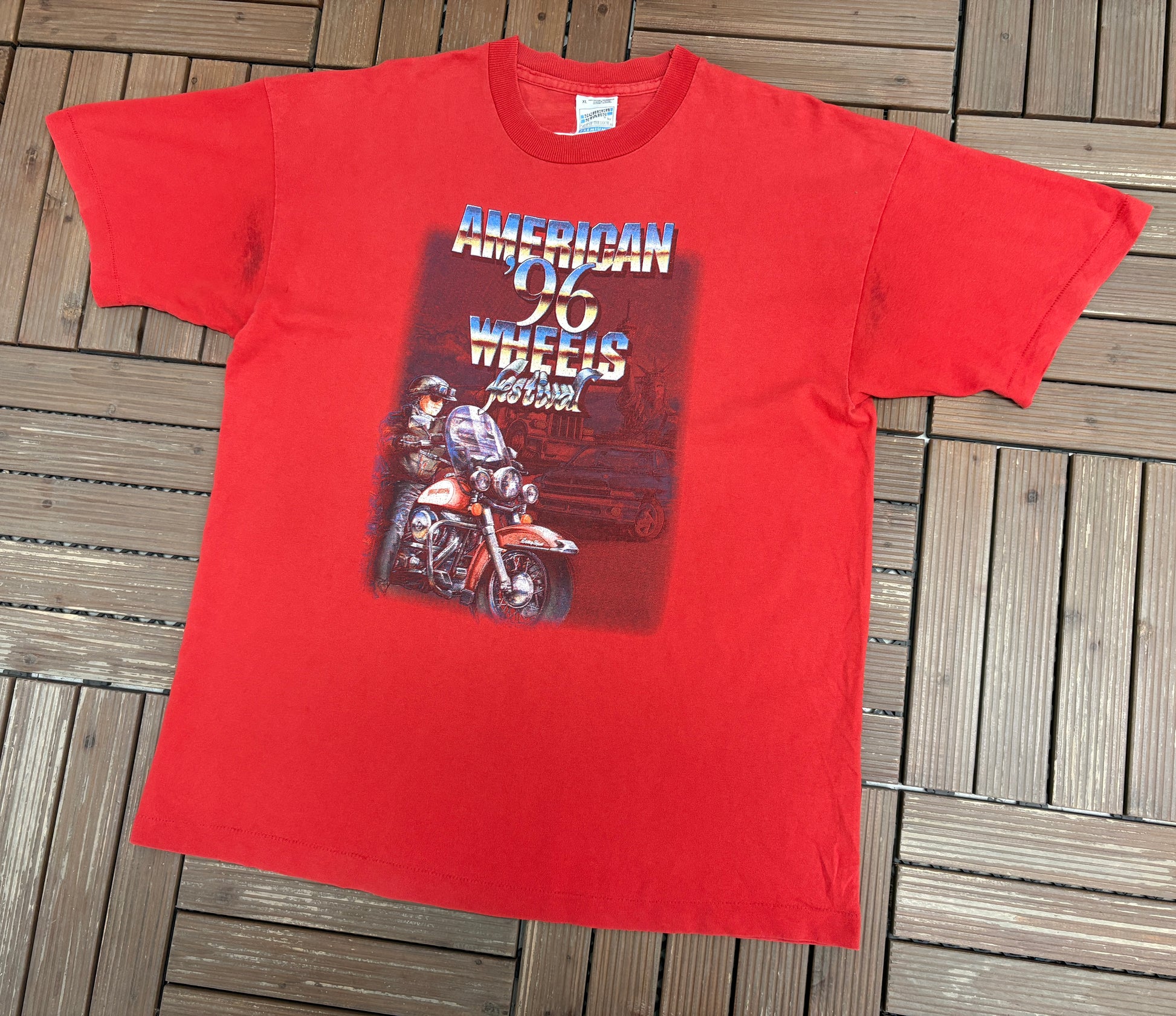 American Wheels Festival 1996 Graphic Tee | Size X-Large | Vintage 1990s Biker Red T-Shirt |