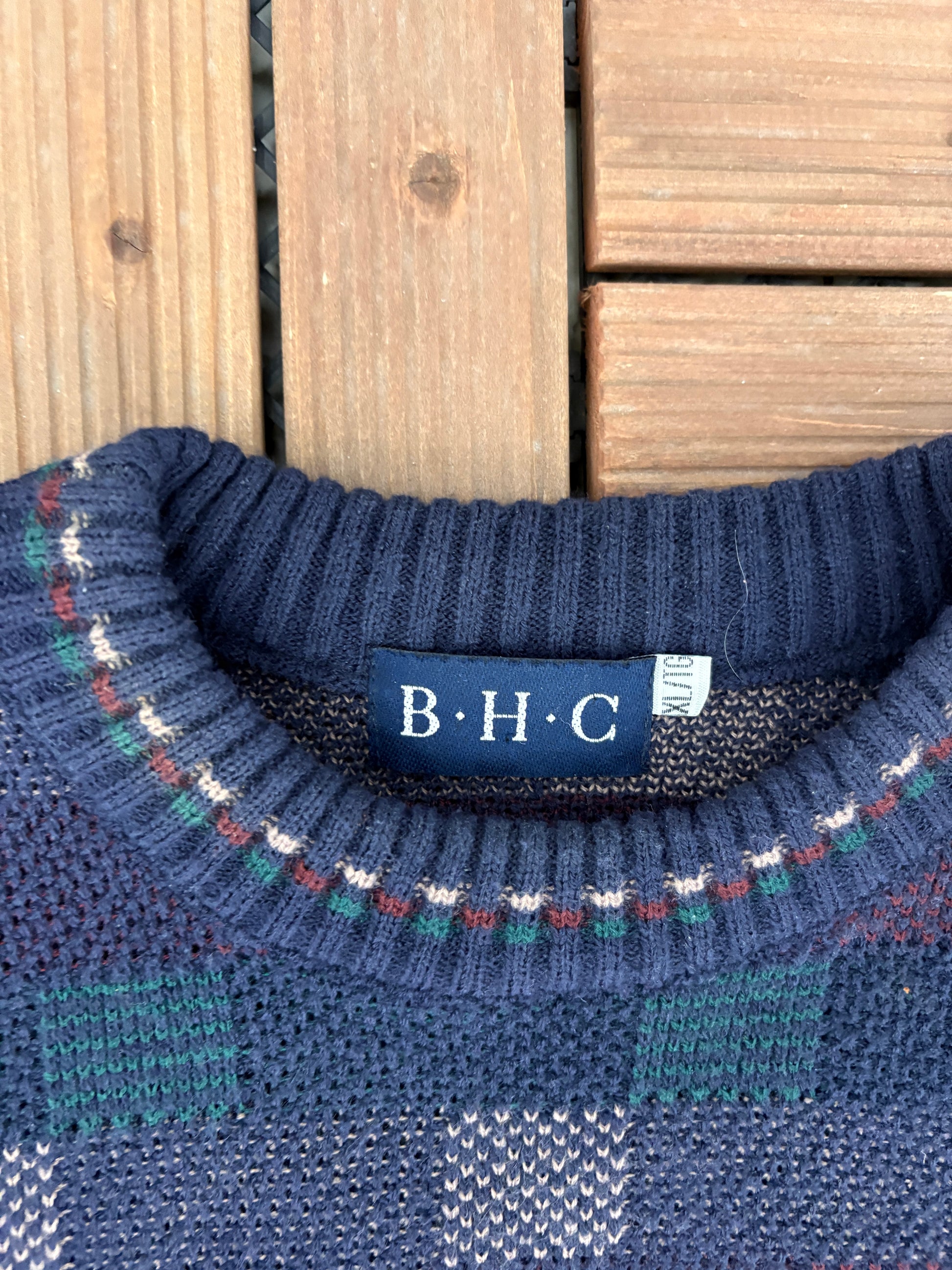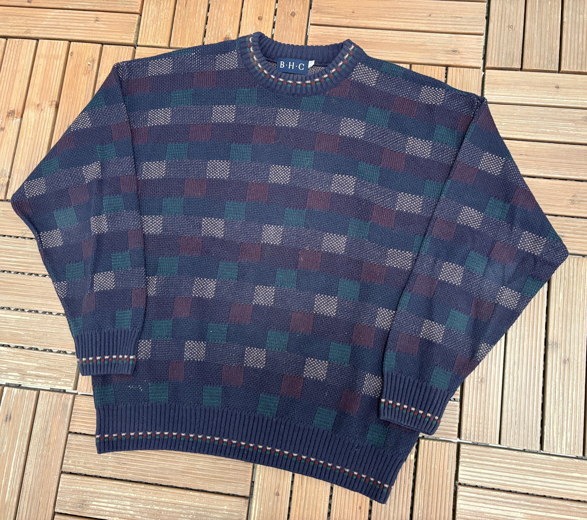 B.H.C. Boxed Pattern Knit Sweater | Size X-Large | Vintage 2000s Knit Blue Sweatshirt |