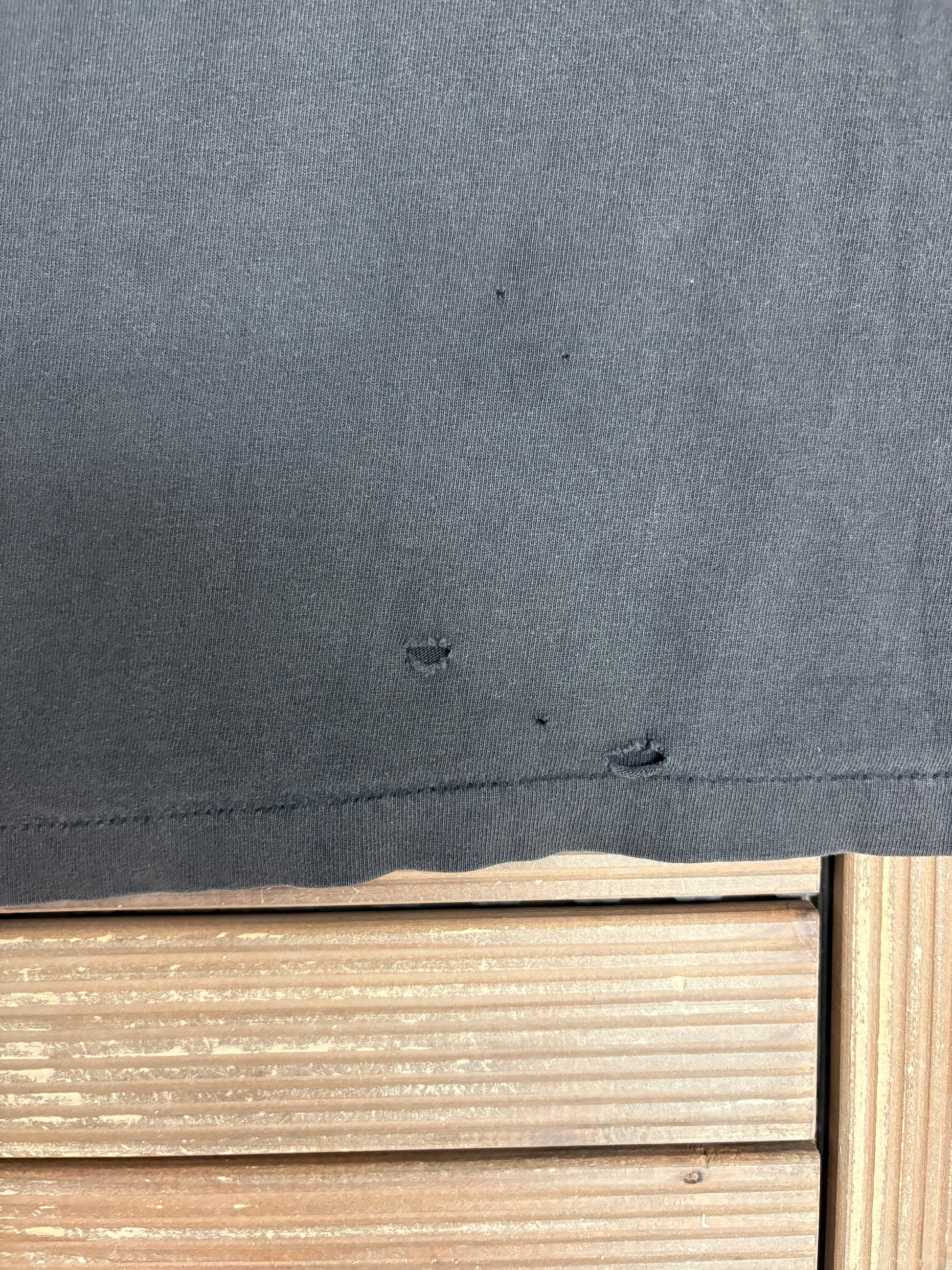 • Some holes by the bottom hem, some fading of the black and minor neckline shredding